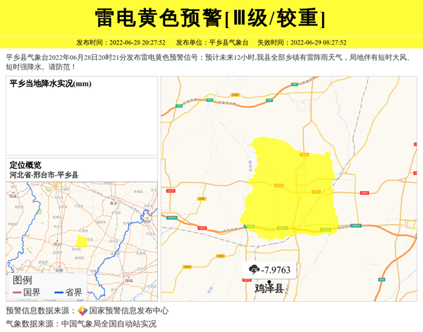 平乡县气象台2022年06月28日20时21分发布雷电黄色预警信号:预计未来12小时,我县全部乡镇有雷阵雨天气,局地伴有短时大风、短时强降水。请防范! 信息来源:国家预警信息发布中心; 发布单位:平乡县气象台。