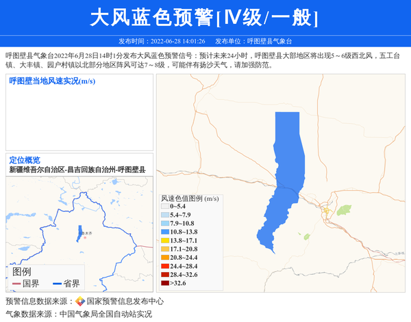 呼图壁县气象台2022年6月28日14时1分发布大风蓝色预警信号:预计未来24小时,呼图壁县大部地区将出现5~6级西北风,五工台镇、大丰镇、园户村镇以北部分地区阵风可达7~8级,可能伴有扬沙天气,请加强防范。 信息来源:国家预警信息发布中心; 发布单位:呼图壁县气象台。