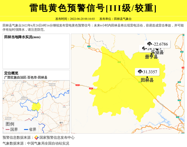 田林县气象台2022年6月28日8时16分继续发布雷电黄色预警信号:未来6小时内田林县将出现雷电活动,容易造成雷击事故,并可能伴有短时强降水,请注意防范。 信息来源:国家预警信息发布中心; 发布单位:田林县气象台。