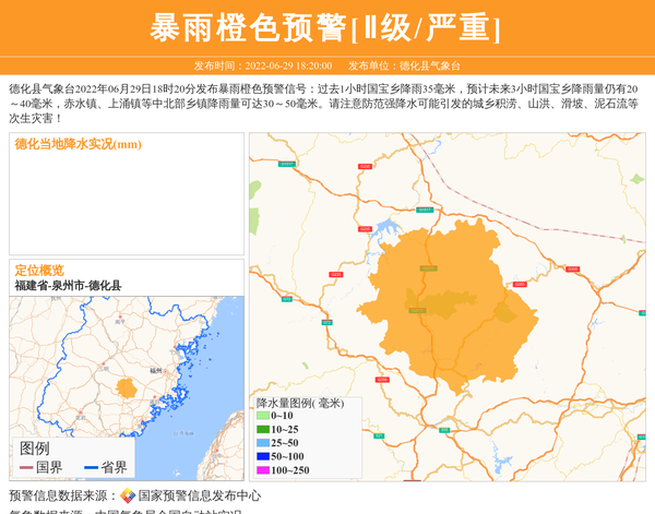德化县气象台2022年06月29日18时20分发布暴雨橙色预警信号:过去1小时国宝乡降雨35毫米,预计未来3小时国宝乡降雨量仍有20~40毫米,赤水镇、上涌镇等中北部乡镇降雨量可达30~50毫米。请注意防范强降水可能引发的城乡积涝、山洪、滑坡、泥石流等次生灾害! 信息来源:国家预警信息发布中心; 发布单位:德化县气象台。