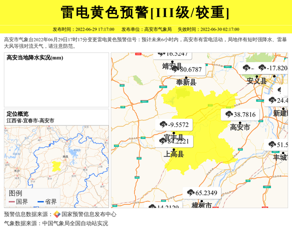 高安市气象台2022年06月29日17时17分变更雷电黄色预警信号:预计未来6小时内,高安市有雷电活动,局地伴有短时强降水、雷暴大风等强对流天气,请注意防范。 信息来源:国家预警信息发布中心; 发布单位:高安市气象局。