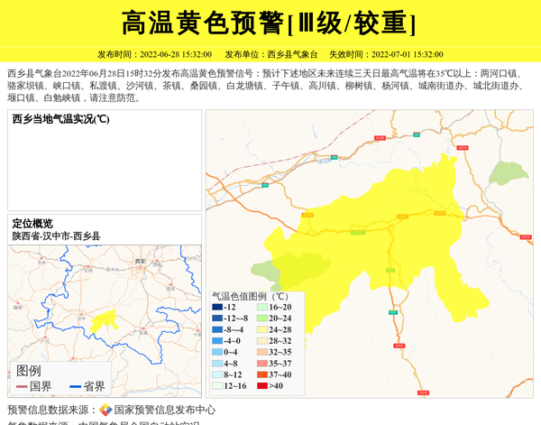 西乡县气象台2022年06月28日15时32分发布高温黄色预警信号:预计下述地区未来连续三天日最高气温将在35℃以上:两河口镇、骆家坝镇、峡口镇、私渡镇、沙河镇、茶镇、桑园镇、白龙塘镇、子午镇、高川镇、柳树镇、杨河镇、城南街道办、城北街道办、堰口镇、白勉峡镇,请注意防范。 信息来源:国家预警信息发布中心; 发布单位:西乡县气象台。