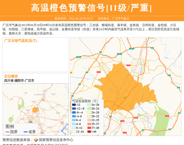广汉市气象台2022年06月28日09时36分发布高温橙色预警信号:三水镇、雒城街道、南丰镇、金鱼镇、汉州街道、金轮镇、小汉镇、向阳镇、三星堆镇、高坪镇、连山镇、金雁街道等镇(街道)未来24小时内最高气温将升至35℃以上,请注意防范高温引发城镇、森林火灾,避免或减少高温作业。 信息来源:国家预警信息发布中心; 发布单位:广汉市气象台。