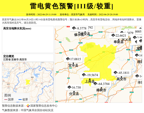 高安市气象台2022年06月29日11时19分发布雷电黄色预警信号:预计未来6小时内,高安市有雷电活动,局地伴有短时强降水、雷暴大风等强对流天气,请注意防范。 信息来源:国家预警信息发布中心; 发布单位:高安市气象局。