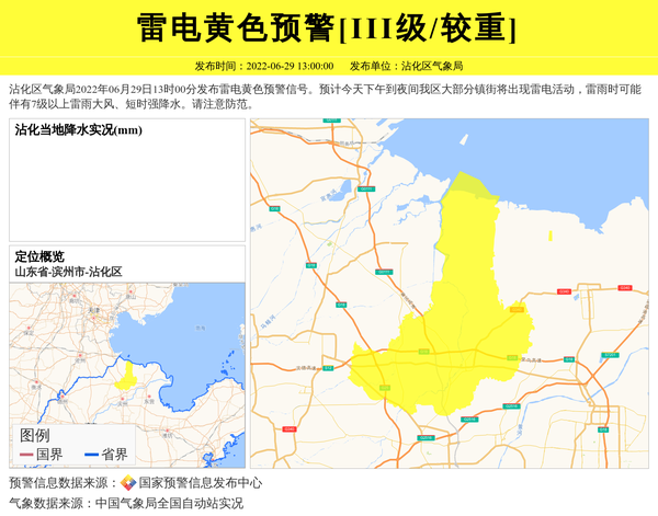 沾化区气象局2022年06月29日13时00分发布雷电黄色预警信号。预计今天下午到夜间我区大部分镇街将出现雷电活动,雷雨时可能伴有7级以上雷雨大风、短时强降水。请注意防范。 信息来源:国家预警信息发布中心; 发布单位:沾化区气象局。