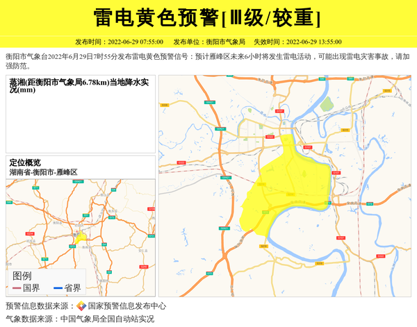 衡阳市气象台2022年6月29日7时55分发布雷电黄色预警信号:预计雁峰区未来6小时将发生雷电活动,可能出现雷电灾害事故,请加强防范。 信息来源:国家预警信息发布中心; 发布单位:衡阳市气象局。