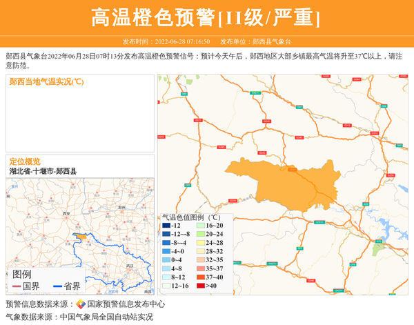 郧西县气象台2022年06月28日07时13分发布高温橙色预警信号:预计今天午后,郧西地区大部乡镇最高气温将升至37℃以上,请注意防范。 信息来源:国家预警信息发布中心; 发布单位:郧西县气象台。