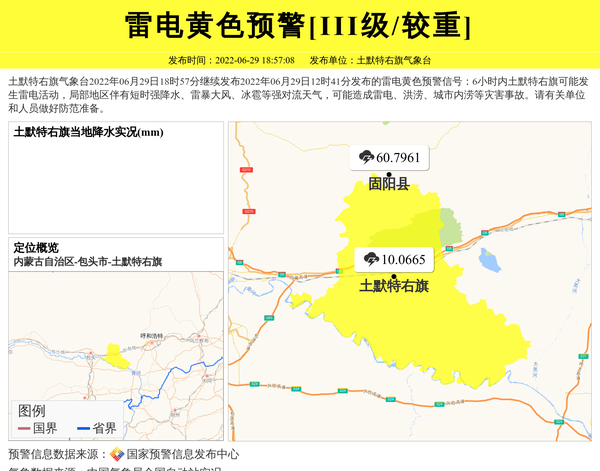 土默特右旗气象台2022年06月29日18时57分继续发布2022年06月29日12时41分发布的雷电黄色预警信号:6小时内土默特右旗可能发生雷电活动,局部地区伴有短时强降水、雷暴大风、冰雹等强对流天气,可能造成雷电、洪涝、城市内涝等灾害事故。请有关单位和人员做好防范准备。 信息来源:国家预警信息发布中心; 发布单位:土默特右旗气象台。