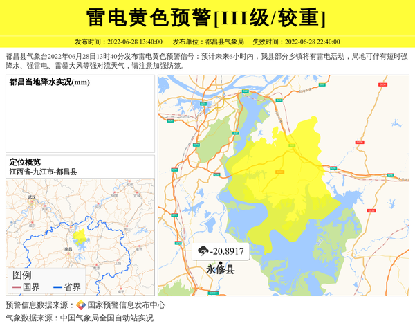 都昌县气象台2022年06月28日13时40分发布雷电黄色预警信号:预计未来6小时内,我县部分乡镇将有雷电活动,局地可伴有短时强降水、强雷电、雷暴大风等强对流天气,请注意加强防范。 信息来源:国家预警信息发布中心; 发布单位:都昌县气象局。