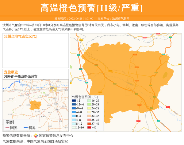 汝州市气象台2022年6月28日11时01分发布高温橙色预警信号:预计今天白天,我市小屯、蟒川、汝南、纸坊等全部乡镇、街道最高气温将升至37℃以上,请注意防范高温天气带来的不利影响。 信息来源:国家预警信息发布中心; 发布单位:汝州市气象局。