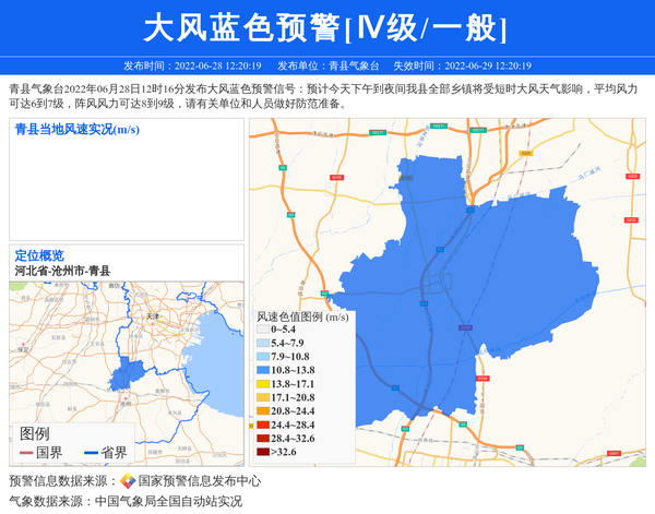 青县气象台2022年06月28日12时16分发布大风蓝色预警信号:预计今天下午到夜间我县全部乡镇将受短时大风天气影响,平均风力可达6到7级,阵风风力可达8到9级,请有关单位和人员做好防范准备。 信息来源:国家预警信息发布中心; 发布单位:青县气象台。