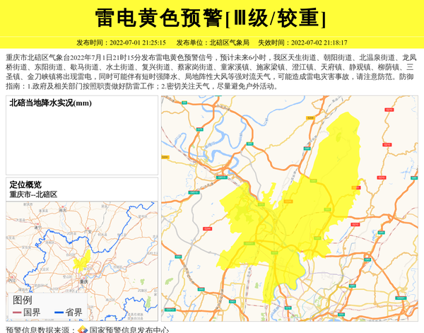 重庆市北碚区气象台2022年7月1日21时15分发布雷电黄色预警信号,预计未来6小时,我区天生街道、朝阳街道、北温泉街道、龙凤桥街道、东阳街道、歇马街道、水土街道、复兴街道、蔡家岗街道、童家溪镇、施家梁镇、澄江镇、天府镇、静观镇、柳荫镇、三圣镇、金刀峡镇将出现雷电,同时可能伴有短时强降水、局地阵性大风等强对流天气,可能造成雷电灾害事故,请注意防范。防御指南:1.政府及相关部门按照职责做好防雷工作;2.密切关注天气,尽量避免户外活动。 信息来源:国家预警信息发布中心; 发布单位:北碚区气象局。