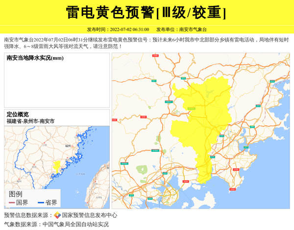 南安市气象台2022年07月02日06时31分继续发布雷电黄色预警信号:预计未来6小时我市中北部部分乡镇有雷电活动,局地伴有短时强降水、6~8级雷雨大风等强对流天气,请注意防范! 信息来源:国家预警信息发布中心; 发布单位:南安市气象台。
