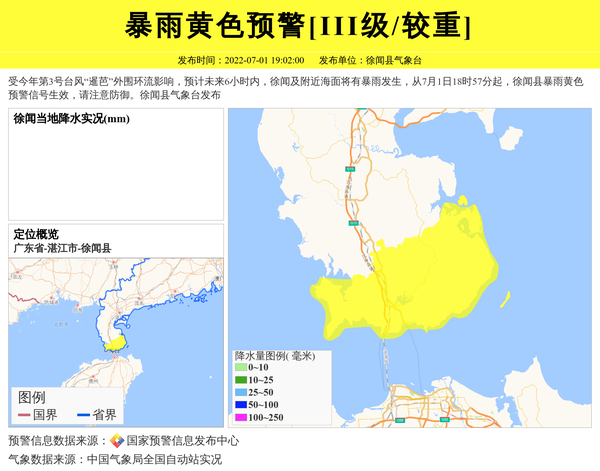 受今年第3号台风“暹芭”外围环流影响,预计未来6小时内,徐闻及附近海面将有暴雨发生,从7月1日18时57分起,徐闻县暴雨黄色预警信号生效,请注意防御。徐闻县气象台发布 信息来源:国家预警信息发布中心; 发布单位:徐闻县气象台。