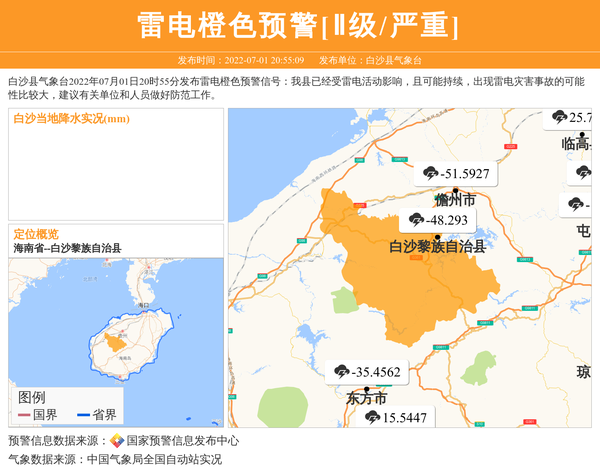白沙县气象台发布雷电橙色预警[Ⅱ级/严重]