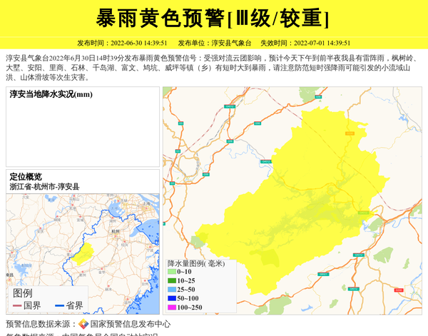 淳安县气象台2022年6月30日14时39分发布暴雨黄色预警信号:受强对流云团影响,预计今天下午到前半夜我县有雷阵雨,枫树岭、大墅、安阳、里商、石林、千岛湖、富文、鸠坑、威坪等镇(乡)有短时大到暴雨,请注意防范短时强降雨可能引发的小流域山洪、山体滑坡等次生灾害。 信息来源:国家预警信息发布中心; 发布单位:淳安县气象台。