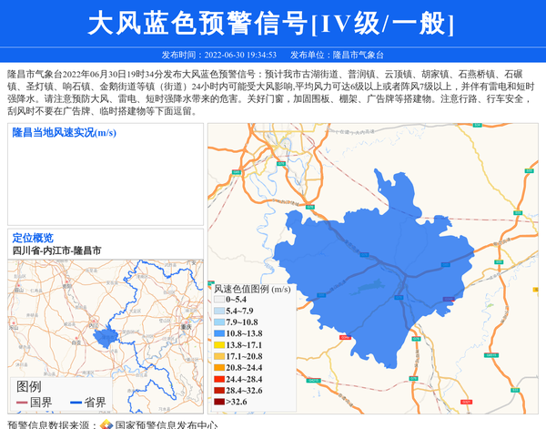 隆昌市气象台2022年06月30日19时34分发布大风蓝色预警信号:预计我市古湖街道、普润镇、云顶镇、胡家镇、石燕桥镇、石碾镇、圣灯镇、响石镇、金鹅街道等镇(街道)24小时内可能受大风影响,平均风力可达6级以上或者阵风7级以上,并伴有雷电和短时强降水。请注意预防大风、雷电、短时强降水带来的危害。关好门窗,加固围板、棚架、广告牌等搭建物。注意行路、行车安全,刮风时不要在广告牌、临时搭建物等下面逗留。 信息来源:国家预警信息发布中心; 发布单位:隆昌市气象台。