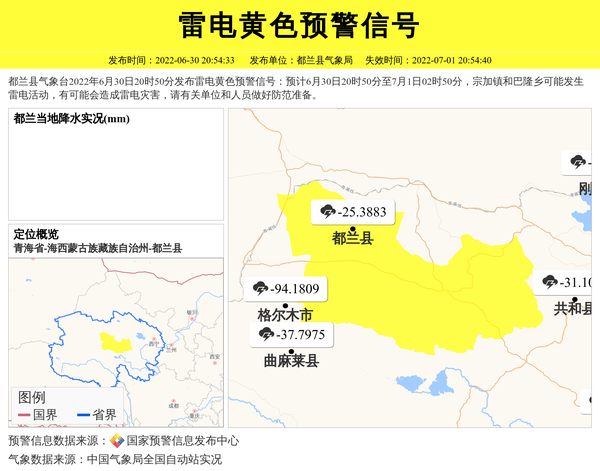 都兰县气象台2022年6月30日20时50分发布雷电黄色预警信号:预计6月30日20时50分至7月1日02时50分,宗加镇和巴隆乡可能发生雷电活动,有可能会造成雷电灾害,请有关单位和人员做好防范准备。 信息来源:国家预警信息发布中心; 发布单位:都兰县气象局。