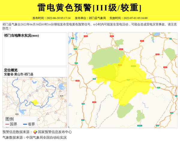 祁门县气象台2022年06月30日05时16分继续发布雷电黄色预警信号。6小时内可能发生雷电活动,可能会造成雷电灾害事故。请注意防范! 信息来源:国家预警信息发布中心; 发布单位:祁门县气象局。