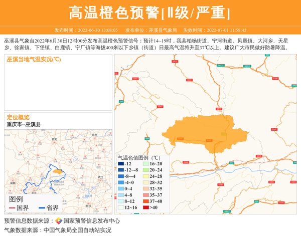 巫溪县气象台2022年6月30日12时00分发布高温橙色预警信号:预计14~19时,我县柏杨街道、宁河街道、凤凰镇、大河乡、天星乡、徐家镇、下堡镇、白鹿镇、宁厂镇等海拔400米以下乡镇(街道)日最高气温将升至37℃以上。建议广大市民做好防暑降温。 信息来源:国家预警信息发布中心; 发布单位:巫溪县气象局。