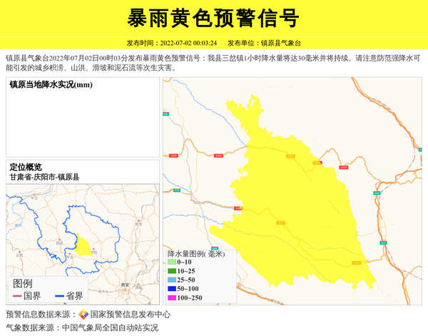 镇原县气象台2022年07月02日00时03分发布暴雨黄色预警信号:我县三岔镇1小时降水量将达30毫米并将持续。请注意防范强降水可能引发的城乡积涝、山洪、滑坡和泥石流等次生灾害。 信息来源:国家预警信息发布中心; 发布单位:镇原县气象台。