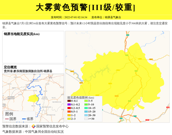 锦屏县气象台7月1日2时16分发布大雾黄色预警信号:预计未来12小时我县部分路段将出现能见度小于500米的大雾,请注意交通安全。 信息来源:国家预警信息发布中心; 发布单位:锦屏县气象台。