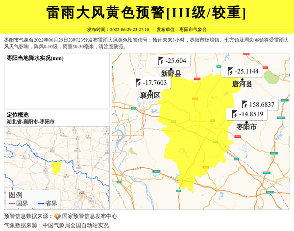 枣阳市气象台2022年06月29日23时23分发布雷雨大风黄色预警信号:预计未来3小时,枣阳市杨垱镇、七方镇及周边乡镇将受雷雨大风天气影响,阵风8-10级,雨量30-50毫米,请注意防范。 信息来源:国家预警信息发布中心; 发布单位:枣阳市气象台。