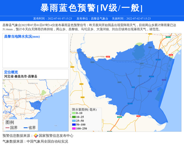 昌黎县气象台2022年07月01日07时14分发布暴雨蓝色预警信号:昨天夜间开始我县出现雷阵雨天气,目前两山乡累计降雨量已达51.6mm,预计今天白天降雨仍将持续,两山乡、昌黎镇、马坨店乡、大蒲河镇、刘台庄镇将出现暴雨天气,请范范。 信息来源:国家预警信息发布中心; 发布单位:昌黎县气象台。
