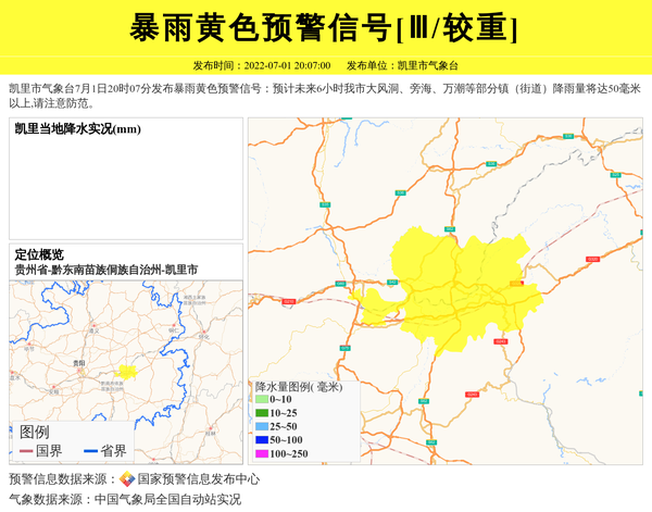 凯里市气象台7月1日20时07分发布暴雨黄色预警信号:预计未来6小时我市大风洞、旁海、万潮等部分镇(街道)降雨量将达50毫米以上,请注意防范。 信息来源:国家预警信息发布中心; 发布单位:凯里市气象台。