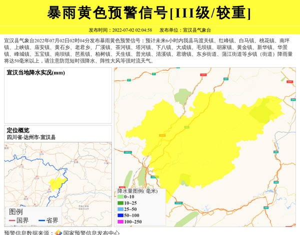 宣汉县气象台2022年07月02日02时04分发布暴雨黄色预警信号:预计未来6小时内我县马渡关镇、红峰镇、白马镇、桃花镇、南坪镇、上峡镇、庙安镇、黄石乡、老君乡、厂溪镇、茶河镇、塔河镇、下八镇、大成镇、毛坝镇、胡家镇、黄金镇、新华镇、华景镇、峰城镇、五宝镇、南坝镇、芭蕉镇、柏树镇、天生镇、普光镇、清溪镇、君塘镇、东乡街道、蒲江街道等乡镇(街道)降雨量将达50毫米以上,请注意防范短时强降水、阵性大风等强对流天气。 信息来源:国家预警信息发布中心; 发布单位:宣汉县气象台。