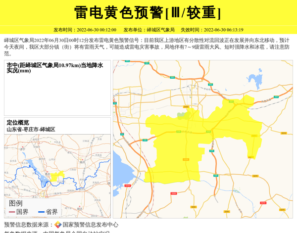 峄城区气象局2022年06月30日00时12分发布雷电黄色预警信号:目前我区上游地区有分散性对流回波正在发展并向东北移动,预计今天夜间,我区大部分镇(街)将有雷雨天气,可能造成雷电灾害事故,局地伴有7~9级雷雨大风、短时强降水和冰雹,请注意防范。 信息来源:国家预警信息发布中心; 发布单位:峄城区气象局。