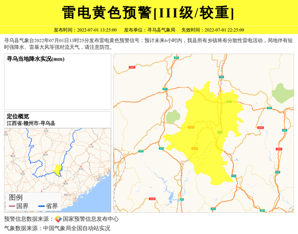 寻乌县气象台2022年07月01日13时25分发布雷电黄色预警信号:预计未来6小时内,我县所有乡镇将有分散性雷电活动,局地伴有短时强降水、雷暴大风等强对流天气,请注意防范。 信息来源:国家预警信息发布中心; 发布单位:寻乌县气象局。