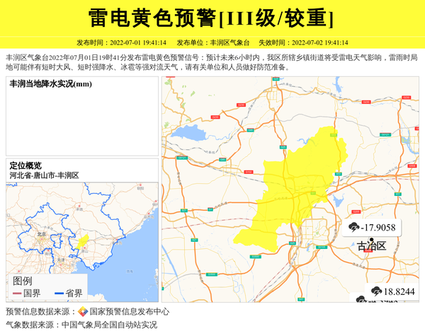 丰润区气象台2022年07月01日19时41分发布雷电黄色预警信号:预计未来6小时内,我区所辖乡镇街道将受雷电天气影响,雷雨时局地可能伴有短时大风、短时强降水、冰雹等强对流天气,请有关单位和人员做好防范准备。 信息来源:国家预警信息发布中心; 发布单位:丰润区气象台。