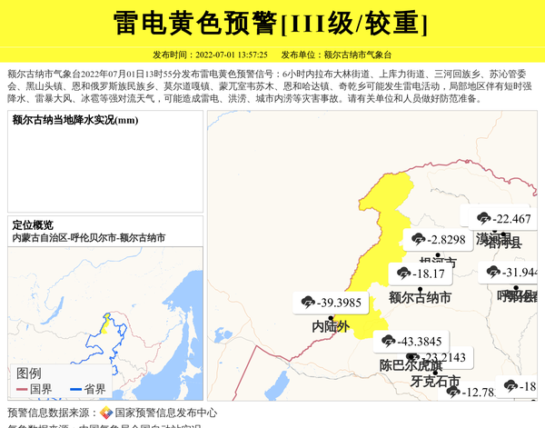 额尔古纳市气象台2022年07月01日13时55分发布雷电黄色预警信号:6小时内拉布大林街道、上库力街道、三河回族乡、苏沁管委会、黑山头镇、恩和俄罗斯族民族乡、莫尔道嘎镇、蒙兀室韦苏木、恩和哈达镇、奇乾乡可能发生雷电活动,局部地区伴有短时强降水、雷暴大风、冰雹等强对流天气,可能造成雷电、洪涝、城市内涝等灾害事故。请有关单位和人员做好防范准备。 信息来源:国家预警信息发布中心; 发布单位:额尔古纳市气象台。