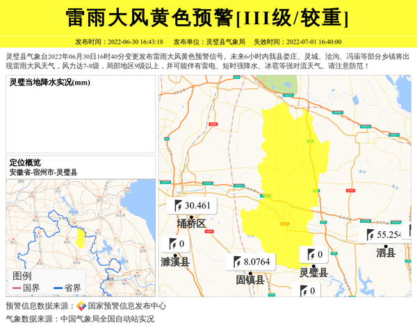 灵璧县气象台2022年06月30日16时40分变更发布雷雨大风黄色预警信号。未来6小时内我县娄庄、灵城、浍沟、冯庙等部分乡镇将出现雷雨大风天气,风力达7-8级,局部地区9级以上,并可能伴有雷电、短时强降水、冰雹等强对流天气。请注意防范! 信息来源:国家预警信息发布中心; 发布单位:灵璧县气象局。