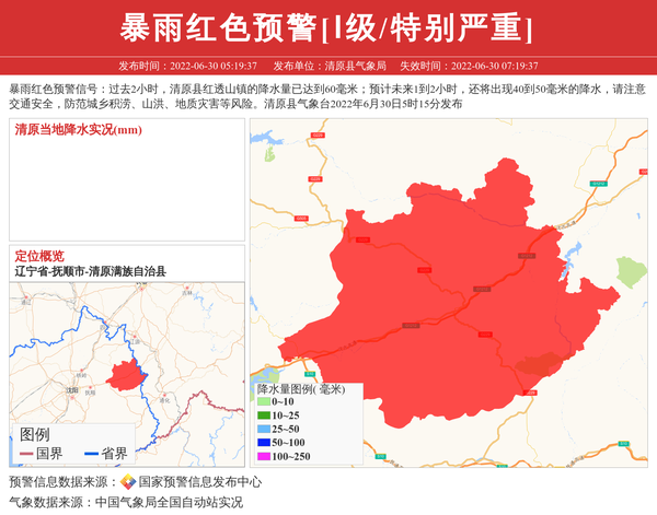 暴雨红色预警信号:过去2小时,清原县红透山镇的降水量已达到60毫米;预计未来1到2小时,还将出现40到50毫米的降水,请注意交通安全,防范城乡积涝、山洪、地质灾害等风险。清原县气象台2022年6月30日5时15分发布 信息来源:国家预警信息发布中心; 发布单位:清原县气象局。