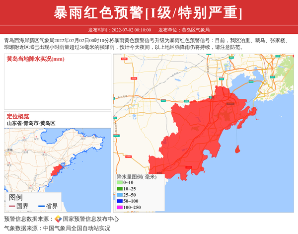 青岛西海岸新区气象局2022年07月02日00时10分将暴雨黄色预警信号升级为暴雨红色预警信号:目前,我区泊里、藏马、张家楼、琅琊附近区域已出现小时雨量超过50毫米的强降雨,预计今天夜间,以上地区强降雨仍将持续,请注意防范。 信息来源:国家预警信息发布中心; 发布单位:黄岛区气象局。