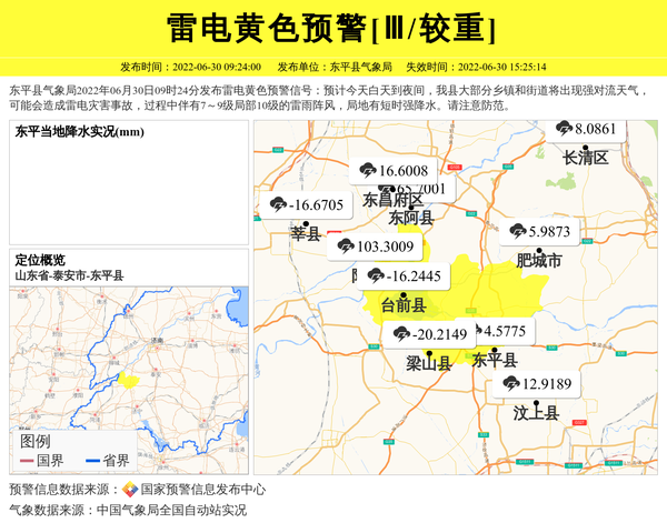 东平县气象局2022年06月30日09时24分发布雷电黄色预警信号:预计今天白天到夜间,我县大部分乡镇和街道将出现强对流天气,可能会造成雷电灾害事故,过程中伴有7~9级局部10级的雷雨阵风,局地有短时强降水。请注意防范。 信息来源:国家预警信息发布中心; 发布单位:东平县气象局。