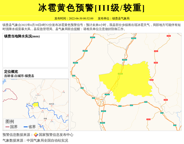 镇赉县气象台2022年6月30日0时52分发布冰雹黄色预警信号:预计未来6小时,我县部分乡镇将出现冰雹天气,局部地方可能伴有短时强降水或雷暴大风,县应急管理局、县气象局联合提醒:请相关单位注意做好防御工作。 信息来源:国家预警信息发布中心; 发布单位:镇赉县气象局。