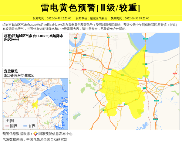 绍兴市越城区气象台2022年6月30日12时23分发布雷电黄色预警信号:受强对流云团影响,预计今天中午到傍晚我区所有镇(街道)有较强雷电天气,并可伴有短时强降水和7~9级雷雨大风,请注意安全,尽量避免户外活动。 信息来源:国家预警信息发布中心; 发布单位:越城区气象台。