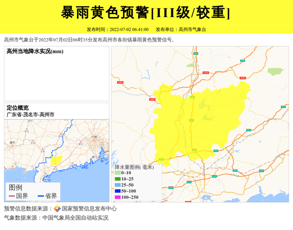 高州市气象台于2022年07月02日06时35分发布高州市各街镇暴雨黄色预警信号。 信息来源:国家预警信息发布中心; 发布单位:高州市气象台。