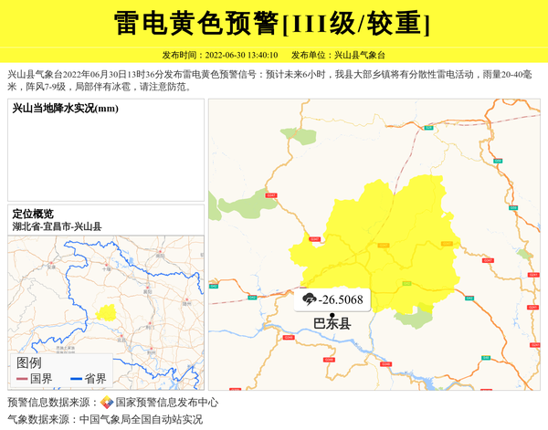 兴山县气象台2022年06月30日13时36分发布雷电黄色预警信号:预计未来6小时,我县大部乡镇将有分散性雷电活动,雨量20-40毫米,阵风7-9级,局部伴有冰雹,请注意防范。 信息来源:国家预警信息发布中心; 发布单位:兴山县气象台。