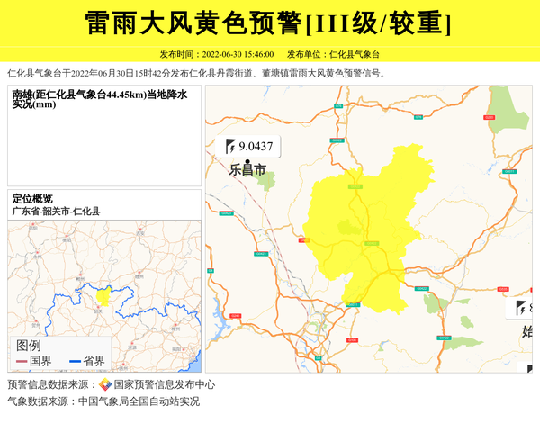 仁化县气象台于2022年06月30日15时42分发布仁化县丹霞街道、董塘镇雷雨大风黄色预警信号。 信息来源:国家预警信息发布中心; 发布单位:仁化县气象台。