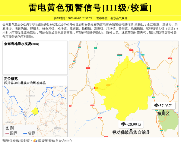 会东县气象台2022年07月02日02时33分对2022年07月01日20时46分发布的雷电黄色预警信号进行第1次确认:金江街道、溜姑乡、老君滩乡、满银沟镇、野租乡、鲹鱼河镇、松坪镇、嘎吉镇、铁柳镇、淌塘镇、堵格镇、姜州镇、乌东德镇、铅锌镇等乡镇(街道)6小时内可能发生雷电活动,可能会造成雷电灾害事故,可能伴有短时强降水、阵性大风、冰雹等强对流天气,请注意防范灾害性天气可能带来的不利影响。 信息来源:国家预警信息发布中心; 发布单位:会东县气象台。