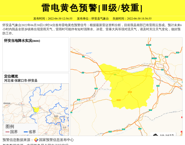 怀安县气象台发布雷电黄色预警[Ⅲ级/较重]
