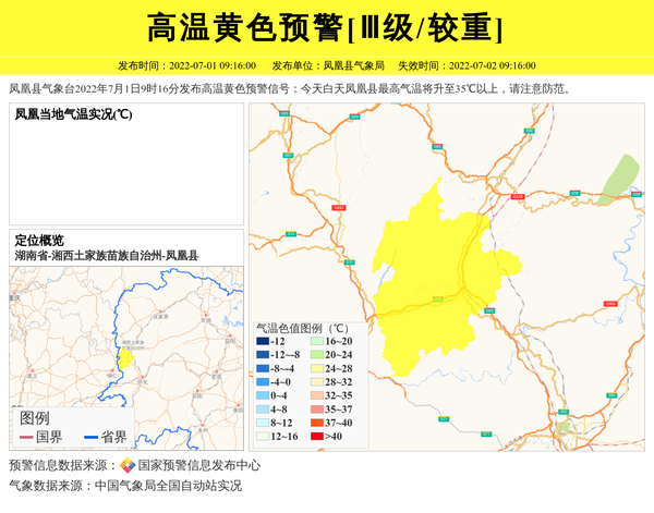 凤凰县气象台2022年7月1日9时16分发布高温黄色预警信号:今天白天凤凰县最高气温将升至35℃以上,请注意防范。 信息来源:国家预警信息发布中心; 发布单位:凤凰县气象局。