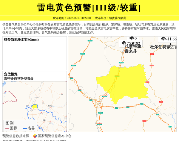 镇赉县气象台2022年6月30日0时29分发布雷电黄色预警信号:目前我县嘎什根乡、东屏镇、坦途镇、哈吐气乡有对流云系发展,预计未来6小时内,我县大部乡镇仍有中等以上强度的雷电活动,可能会造成雷电灾害事故,并将伴有短时强降水、雷雨大风或冰雹等强对流天气,县应急管理局、县气象局联合提醒:注意做好防范工作。 信息来源:国家预警信息发布中心; 发布单位:镇赉县气象局。