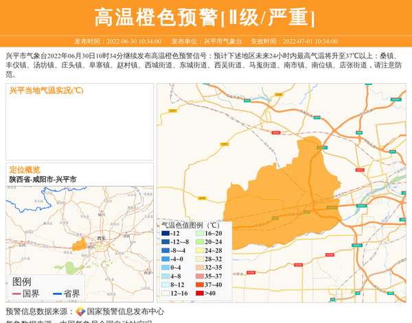 兴平市气象台2022年06月30日10时34分继续发布高温橙色预警信号:预计下述地区未来24小时内最高气温将升至37℃以上:桑镇、丰仪镇、汤坊镇、庄头镇、阜寨镇、赵村镇、西城街道、东城街道、西吴街道、马嵬街道、南市镇、南位镇、店张街道,请注意防范。 信息来源:国家预警信息发布中心; 发布单位:兴平市气象台。