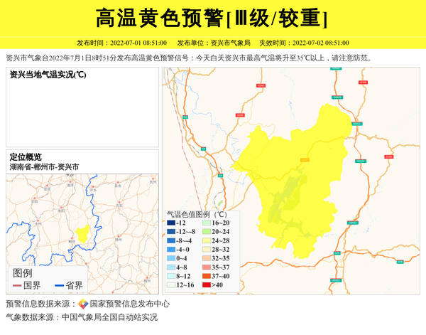 资兴市气象台2022年7月1日8时51分发布高温黄色预警信号:今天白天资兴市最高气温将升至35℃以上,请注意防范。 信息来源:国家预警信息发布中心; 发布单位:资兴市气象局。