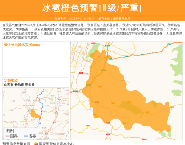壶关县气象台2022年7月1日16时45分发布冰雹橙色预警信号。 预警区域:壶关县全区。 预计6小时内可能出现冰雹天气,并可能造成雹灾。 防御指南: 1.政府及相关部门按照职责做好防风防雹的应急和抢险工作; 2. 气象部门适时开展人工防雹作业; 3. 户外行人立即到安全的地方暂避; 4. 驱赶家禽、牲畜进入有顶蓬的场所,妥善保护易受冰雹袭击的汽车等室外物品或者设备; 5. 注意防御冰雹天气伴随的雷电灾害。 信息来源:国家预警信息发布中心; 发布单位:壶关县气象局。